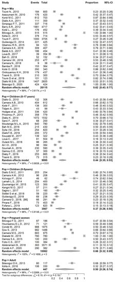 In terms of the age of the population, the studies selected in this systematic review covered all age groups. Herein, the prevalence of intestinal parasites found in children less than 17 years old was 44%. When considering children under 5, the prevalence of intestinal parasites was 37%. This prevalence of intestinal parasites among under-five children was higher than that found in Saudi Arabia (17.7%) or Zambia (19.6%), lower than findings in Pakistan (52.8%), and slightly similar to the prevalence in Sudan (30%) [97,98]. Similar results were reported recently in Colombia, where prevalences of 37% (95% CI: 26–49) and 66% (95% CI: 52–78) were reported in preschoolers and schoolchildren [99]. Behavioral and social practices in children and their weak immune status, especially in under five, may account for the high frequency of intestinal parasitic infections [2,3,8]. With respect to pinworm prevalence, this was very low in children, in contrast with studies reporting this parasite as one of the most important intestinal pathogens in this group [100]. This could be explained by the fact that the identification of pinworms was performed only by microscopic examination of feces and not by the Scotch tape test, which is considered the gold standard for the diagnosis of E. vermicularis [101]. On the other hand, a prevalence of 66% of parasitic infections was found in pregnant women. This finding is similar to a prevalence of 66.7% reported in Burkina Faso [102]. In contrast, lower prevalences have been reported in Ghana (14.3%), Kenya (13.8%), or Ethiopia (27.32%) [103,104,105]. A. duodenale was among the most frequent type of parasite in this group. Infection by this parasite can lead pregnant women to severe anemia, and then there is an increased risk of morbidity and mortality for the mother and the baby after hookworm infections [105]. Maybe the calculation of prevalence for children and pregnant women was subject to bias considering that the detection of parasites is done systematically in these two groups. However, these results are consistent with WHO reports establishing that children and pregnant women are the most affected by soil-transmitted helminth infections [106].