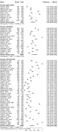 Subgroup analysis of the proportions included in all selected studies showed a prevalence of intestinal parasitic infections as follows: 53% for P1 (before 2010), 61% for P2 (between 2010 and 2013), and 48% for P3 (2014 and after). This difference was not statistically significant. On the other hand, in Upper Guinea, Forest Guinea, and Conakry, a higher prevalence (all parasitosis combined) was noticed before 2014, but a significant decrease in prevalence during P3 was observed in all these localities (p < 0.01) (Figure 6).