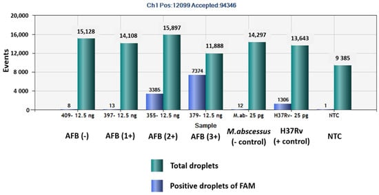 AFB-smear microscopy has a lower limit of detectability of about 5000–10000 AFB/mL in the sputum []. So, the AFB-Scanty, AFB (1+), AFB (2+) and AFB (3+) categories should indicate the presence of 5 AFB/µL, 50 AFB/µL, 500 AFB/µL and 5000 AFB/µL in the sputum, respectively. The present study found that 41.6% of AFB-negative, 100% of AFB-Scanty, 33.3% of AFB (1+), 33.3% of AFB (2+) and 15% of AFB (3+) samples had similar numerical ranges of MTB cells in the sputum compared to ddPCR. A previous study comparing detection of the MTBC via AFB smear and qPCR using a IS6110 assay found that 65.4% of AFB-negative, 36.4% of AFB-Trace, 36% of AFB (1+), 0% of AFB (2+) and 7.7% of AFB (3+) samples all had the same numbers of bacteria []. This study aimed to evaluate the performance of ddPCR in detecting the presence of MTBC in sputum samples. It was able to detect the MTBC in a high percentage of samples, including 100% of AFB- and GeneXpert-positive samples and in some AFB- and GeneXpert-negative samples at 32% and 15%, respectively. However, ddPCR also had some limitations, such as a long turnaround time, high cost per reaction, and the need for well-trained personnel. ddPCR performed reliably and accurately, as every case that was positive according to use of AFB-smear microscopy and GeneXpert was also positive according to use of ddPCR. Moreover, use of ddPCR was able to detect the presence of the MTBC in some samples that were negative according to use of AFB-smear microscopy and GeneXpert.