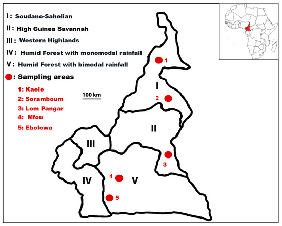 The study areas were localized in three large agroecological zones of Cameroon: the Sudano-Sahelian zone (AEZ I), the High Guinea Savannah zone (AEZ II), and the Humid Forest zone with bimodal rainfall (AEZ V) (Figure 1). A strong climatic gradient runs from the humid forest in the south up to the dry Sudano-Sahelian in the far northern region. The rainy season in the Guinea Savannah zone is from April to October, whereas in the Sudano-Sahelian zone, it is from June to September. Annual rainfall ranges from 1400 to 1700 mm in the Guinea Savannah zone and from 800 to 1400 mm in the Sudano-Sahelian zone. The Humid Forest zone with bimodal rainfall lies at altitudes ranging between 400 and 1000 m above sea level. This zone is characterized by a humid forest and savannah mosaic. The average temperature in this zone is about 26 °C, and the annual average rainfall is 2456.8 mm.