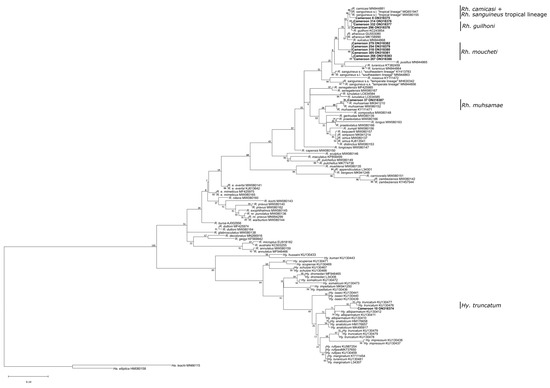 Five tick species collected in the present study, A. flavomaculatum, Ha. camicasi, Ha. houyi, I. moreli, and Rh. moucheti, were sequenced for the first time. The phylogenetic analysis and sequences submitted to GenBank are relevant for future studies. Additionally, sequences confirmed morphological determinations for fully engorged specimens, larvae, and/or nymphs as well as for species collected from unexpected wild animal hosts like Rh. microplus and Rh. linneai. In total, 214 specimens were sequenced and included in the genetic analysis. Phylogenetic analysis confirmed the presence of Rh. camicasi in Cameroon, in sympatry with Rh. guilhoni. Both species belong to the Rhipicephalus sanguineus group and have a similar morphology, but they have different geographic distributions [29].