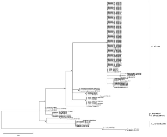 Rickettsia spp. detection was done using real-time PCR to amplify a fragment of the gltA gene for screening. In this first step, 114 Rickettsia spp. positive pools were detected. All positive pools with CT below 35 were further investigated by amplifying the 23S-5S intergenic space gene using a conventional PCR. Sequence data for Rickettsia 23S-5S (ON333673-ON333740) obtained from this study were compiled with reference data from Genbank and aligned using MAFFT (Q-INS-i, 200PAM/k = 2; Gap opening penalty, 1.53) [38]. The optimal nucleotide substitution model was selected using BIC calculations in W-IQTREE [39] and was determined as HKY+F. Maximum likelihood analysis was performed in MEGA v7.0.14 [40] with 1000 bootstraps.