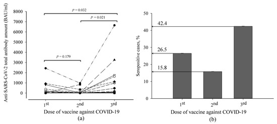 The distribution of anti-SARS-CoV-2 antibody titer in kidney transplant patients after anti-SARS-CoV-2 vaccination: (a) the anti-SARS-CoV-2 variation curve of an individual patient after each dose of vaccine; (b) percentage of seropositive cases from all studied subjects.