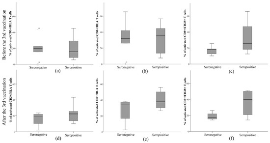Additional evaluation of the numbers of activated immune components, namely CD3+/HLA, CD8+/HLA, and CD8+/CD38+, is presented in Figure 3. The results showed that seropositive subjects had a lower median value of activated CD3+/HLA cells than seronegative ones. Furthermore, there was a positive correlation between CD3+/HLA and anti-SARS-CoV-2 antibody titer in the seropositive group (Spearman’s correlation coefficient 0.685, p = 0.029). After the third dose of the anti-SARS-CoV-2 vaccine, this value increased by 7% and was higher than that in seronegative patients. The median count of activated CD3+/HLA cells did not change after the repeated vaccination. Seropositive patients had a slightly higher median count of activated CD8+/HLA cells than seronegative patients. The median values were almost unchanged after the vaccination in both groups. The most striking difference between the median values of seronegative and seropositive subjects was recorded in the assessment of the amount of CD8+/CD38+. The median of the CD8+/CD38+ ratio was slightly higher in seropositive patients before the vaccination and increased 2 times after the vaccination, while it did not change in the seronegative patients. Moreover, activated CD8+/CD38+ negatively correlated with anti-SARS-CoV-2 antibody titer in this group (Spearman’s correlation coefficient −0.949, p = 0.05). The means of immune cell counts before and after vaccination were not significantly different within or between groups and did not relate to the prevalence of COVID-19.