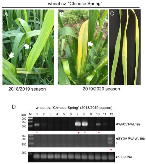 Detection of WhCV1 in wheat grown in the field. (A,B) Representative yellow leaf symptoms in wheat (cv. “Chinese Spring”) in the experimental field during the winter wheat-growing season of 2018/2019 ((A), early April) and 2019/2020 ((B), mid-April). White arrows indicate symptomatic wheat leaves. (C) The detached wheat symptomatic leaf samples from the 2019/2020 season subjected to the vector transmission test (left, an asymptomatic leaf sample was included as a control). (D) RT-PCR detection of WhCV1 from wheat leaf samples (mid-May, growing season 2018/2019). M, 1-kb DNA ladder (Thermo Fisher Scientific, Waltham, MA, USA) used as a size marker. Samples in which a closterovirus (WhCV1-WL19a) or a luteovirus (BYDV-PAV) was detected are indicated by a red plus sign (+) below the gel lane. Asterisks indicated unknown amplicons.