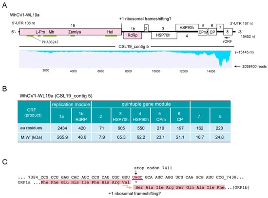 Characteristics of the WhCV1 genome and proteins. (A) Genome structure of the WhCV1-WL19a isolate (CSL19_contig 5) obtained from RNA-seq of the wheat leaf sample (winter wheat-growing season of 2018/2019). The conserved domains, methyltransferase (Mtr), helicase (Hel), RNA-dependent RNA polymerase (RdRP), leader protease (L-Pro), Zemla (see main text), and PHA03247 domains are indicated with light green lines. The ORF8 protein has an RSS_P20 superfamily domain (pfam11757, E-value = 5e−07; not indicated). HSP70h: heat shock protein 70 homolog; HSP90h: ~60 kDa protein; CPm: minor coat protein; CP: coat protein. Note that a small reverse ORF (rORF, 525 nt in length) overlapping the ORF8 region was also predicted (no BLAST-P hits). The putative WhCV1-derived sequence reads were mapped to the genome using the Read Mapping algorithm of the CLC Genomics Workbench (parameters: length fraction = 0.75; similarity fraction = 0.95). The y-axis indicates the mapped-read coverage with the maximum read number. (B) The properties of the predicted coding proteins of the WhCV1-WL19a isolate. (C) The putative frameshift site of the replicase (ORF1a-1b fusion protein). Numbers refer to the start and end position of the nucleotide sequences of the WhCV1-WL19a genome and nucleotide sequences related to the frameshift are underlined.