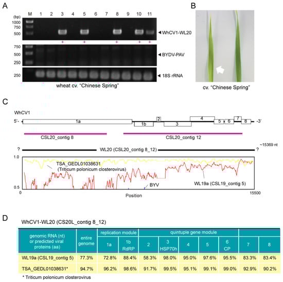RNA-seq analysis was basically performed as described previously [60]. Total RNA samples from wheat leaves from the 2018/2019 growing season (228.0 ng/μL; RNA integrity number, RIN = 7.7; Figure 1A) and wheat leaves infected with a laboratory virus WL20 isolate (see below; 60.0 ng/μL; RIN = not measured) were subjected to RNA-seq analysis. After the rRNA depletion using the Ribo-Zero kit (Illumina, San Diego, CA, United States) or QIASeq FastSelect rRNA removal kit (Qiagen, Hilden, Germany), the sample was employed as a template for the cDNA library construction using the TruSeq RNA Sample Preparation kit v2 (Illumina) or MGIEasy FS DNA Library Prep Set (MGI Tech, Shenzhen, China). Subsequently, the respective library was subjected to deep RNA-seq using the Illumina HiSeq 2000 platform (Illumina, paired-end 101 bp reads) or DNBSEQ-G400RS (MGI, paired-end 150 bp reads). rRNA depletion, cDNA library construction, and RNA-seq analysis were performed by Macrogen Japan Co. (Tokyo, Japan) and Genome-Lead Co. (Kagawa, Japan). After adapter and quality trimming of raw reads (the total read number was 64.0 M reads from Illumina sequencing or 18.2 M reads from DNBSEQ sequencing), the sequence reads were de novo assembled using the CLC Genomics Workbench version 11 (CLC Bio-Qiagen, Aarhus, Denmark) with default parameters (length fraction = 0.5; similarity fraction = 0.8). Assembled sequence contigs (total contig number: 81,494 or 51,964) were used as queries for BLAST analyses against the viral genome RefSeq dataset of the NCBI. Sequence reads were mapped to the virus or virus-like contigs using the Read Mapping algorithm with stringent mapping parameters (length fraction = 0.9; similarity fraction = 0.95) in the CLC Genomics Workbench.