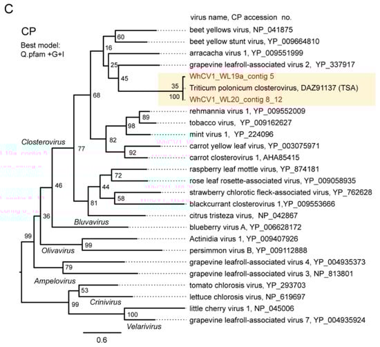 In this study, we discovered two molecularly diverse isolates of a closterovirus tentatively named “wheat closterovirus 1 WL19a and WL20” (WhCV1 WL19a and WL20) from yellowing leaf samples of wheat plants in the IPSR experimental field, Kurashiki, Japan, through RNA-seq analysis (Figure 1A and 2). The genome organization of WhCV1 showed the typical features of monopartite closterovirids, including the presence of the putative +1 ribosomal frameshift site for the expression of the RdRP [12]. Phylogenetic relationships based on the HSP70h, RdRP, and CP amino acid sequence showed that WhCV1 was placed in a clade together with the members of the genus Closterovirus (Figure 4). The BLAST identities of relevant gene products (RdRP, CP, and HSP70h) shared between WhCV1 and members of known Closterivirus species were above the species demarcation criteria (i.e., >25% amino acid sequence divergence) for the genus [12] (Table 2 and Supplementary Figure S3), suggesting that WhCV1, together with TriPCV (a closterovirus candidate identified through transcriptome data mining) [34], represents a member of novel species in the genus Closterovirus. We observed that WhCV1-WL20 had aphid transmissibility (a typical feature of closteroviruses) and typical filamentous virion (Figure 3 and Supplementary Figure S2), along with BYDV-PAV coinfection in some cases (Figure 1D and Table 1).