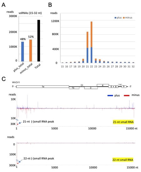 To characterize WhCV1-derived small RNAs, we performed deep sequencing analysis of the small RNA fraction extracted from the “Chinese Spring” yellow leaf samples collected in the field during the 2018/2019 winter wheat-growing season (Figure 1A). Small RNA reads ranging from 15 to 32 nt in length were mapped onto the WhCV1-WL19a genome (CSL19_contig 5). WhCV1-WL19a-derived viral small RNAs (vsRNAs) accounted for 7.6% (2747884 reads) of the total small RNAs, and the abundance of negative-strand vsRNAs (52%) was slightly higher than that of positive-strand vsRNAs (48%; Figure 5A). The majority of the WhCV1-WL19a vsRNAs were 21- or 22-nt long for both strands and no clear bias toward adenine (A) or uracil (U) for 5ꞌ-terminal nucleotide was observed (Figure 5B and Supplementary Figure S4A). The 21-nt vsRNAs were distributed across the entire WhCV1-WL19a genome regions with several existing hot spots around both the 5′ and 3′ ends of the genome (Figure 5C), whereas, interestingly, the highly abundant 22-nt small RNAs (and the 21-nt small RNAs to a lesser extent) were predominantly distributed in the 3′-terminal end of the WhCV1-WL19a negative-strand genomic RNA (Figure 5C, arrows and Supplementary Figure S4B,C. When a small RNA dataset derived from wheat cv. “Kitahonami” infected with a betaflexivirus [35] or “Chinese Spring” [36] uninfected with WhCV1 was analyzed, no small RNA read was mapped to the 3′-terminal end of the WhCV1-WL19a negative-strand genomic RNA (data not shown), suggesting that the abundant 22-nt small RNAs were specifically derived from WhCV1 RNAs and probably not from the host plant.