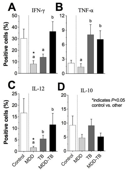 Proportion of cytokine-producing cells from patients and healthy controls. Peripheral blood mononuclear cells were stimulated by phorbol myristate acetate plus ionomycin for 24 h at 37 °C. Brefeldin-A was added 6 h before the end of the culture. Then, cells were fixed, permeabilized, stained by fluorescent mAbs to CD25 or CD69 and cytokines, and analyzed by flow cytometry. The bars denote the percentage of positive cells to IFN-γ (A), TNF-α (B), IL-12 (C), and IL-10 (D) in healthy individuals (control) and patients with major depressive disorder (MDD), tuberculosis (TB), and major depressive disorder in comorbidity with tuberculosis (MDD-TB). A star plot represents the proportions of positive cells to analyzed cytokines in study groups. The literals (a and b) indicate statistic differences at p < 0.05 among pathological groups. The sign (*) points out statistic differences at p < 0.05 between control and indicated pathological groups.
