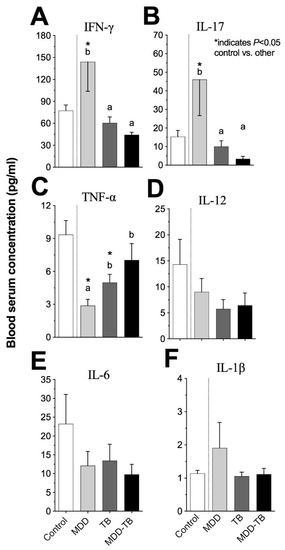 Blood serum pro-inflammatory cytokine levels. Blood serum was analyzed by a Bio-Plex Luminex system. The bars denote the serum concentrations of IFN-γ (A), IL-17 (B), TNF-α (C), IL-1β (D), IL-6 (E), and IL-12 (F) in healthy individuals (control) and patients with major depressive disorder (MDD), tuberculosis (TB), and major depressive disorder in comorbidity with tuberculosis (MDD-TB). The literals (a and b) indicate statistic differences at p < 0.05 among pathological groups. The sign (*) points out statistic differences at p < 0.05 between control and indicated pathological groups.