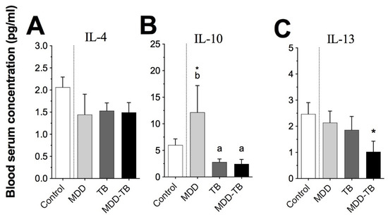 Blood serum anti-inflammatory cytokine levels. Blood serum was analyzed by the Bio-Plex Luminex system. The bars denote the serum concentrations of IL-4 (A), IL-10 (B), and IL-13 (C) in healthy individuals (control) and patients with major depressive disorder (MDD), tuberculosis (TB), and major depressive disorder in comorbidity with tuberculosis (MDD-TB). The literals (a and b) indicate statistic differences at p < 0.05 among pathological groups. The sign (*) points out statistic differences at p < 0.05 between the control and indicated pathological groups.