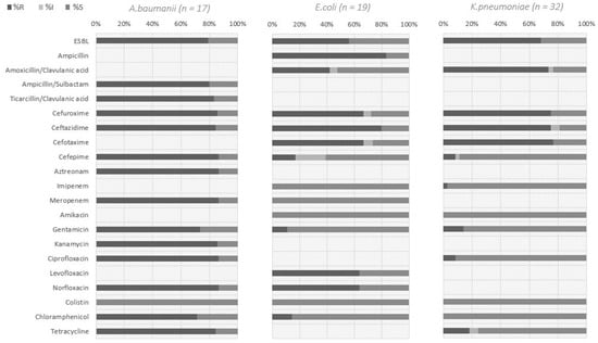 Unfortunately, the observed high levels of ESBL-producing strains of K. pneumoniae and E. coli are becoming common in our hospitals. ESBL-producing strains of Enterobacterales often possess genes conferring resistance to other classes of antimicrobials, including fluoroquinolones and aminoglycosides []. A similar situation is observed in the present study, where ESBL-producing strains of Enterobacterales were characterized by resistance to the groups of antibiotics listed above. Surveillance for antimicrobial resistance should be implemented to stop the spread of Enterobacterales, which produce extended-spectrum beta-lactamases. However, beta-lactam antimicrobials are the most commonly used antibiotics in hospitals []. Accordingly, their inefficiency is a big problem for our healthcare system, requiring additional patient stays in the hospital, as well as additional funding [].