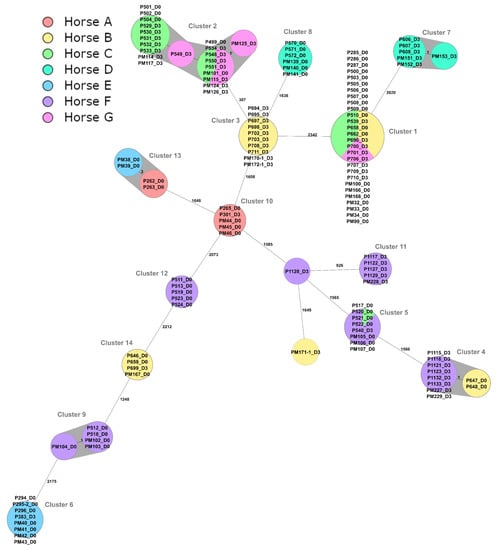 One hundred twenty-seven E. coli isolates from inseminated mares before (D0) and after (D3) insemination, were allocated into fourteen clusters by cgMLST analysis (Figure 1). There was, at most, a one-allele difference between isolates within each cluster, except for Cluster 2 and 13 where there was a three-allele difference. Therefore, isolates within each cluster were highly genetically related, i.e. the same strain. Nine clusters consisted of isolates from one mare (Cluster 3, 6, 7, 8, 9, 10, 11 and 14), whereas five clusters consisted of isolates from 2 to 3 mares (Cluster 1, 2, 4 5 and 13 (Figure 1)). The finding of isolates from different mares in the same clusters suggests a possible spread within the herd.