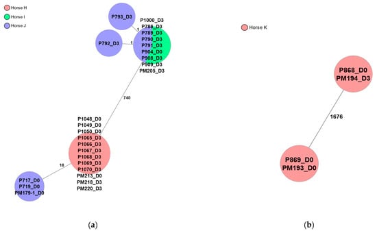 (a) Minimum spanning tree (MST) created for 26 Streptococcus equisimilis from mares in Boden in northern Sweden visualizing core genome multi-locus sequence typing (cgMLST) results. (b) Minimum spanning tree (MST) created for four Staphylococcus simulans from mares visualizing core genome multi-locus sequence typing (cgMLST) results. Nodes corresponding to sequenced isolates are colored according to individual mares. D0 and D3 are referring to isolates before and after insemination, respectively. The numbers between nodes represent allelic differences. Line lengths are not proportional to the number of differences.