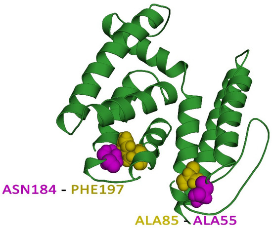 Disulphide engineering of the vaccine protein. Residue pairs shown in purple (ALA55, ASN184), and olive (ALA85, PHE197) spheres were mutated to cysteine residues to form a disulphide bridge between them.