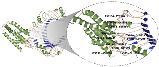 TLR2 plays a key role in staphylococcal illness by regulating the stimulation of polymorphonuclear neutrophils, the expression of adhesion molecules, chemotaxis, and the expression of chemoattractant receptors, as well as the detection of ligands and phagocytosis, among other professional phagocyte functions. Lipoproteins appear to play a key role in TLR2 activation by staphylococci, according to growing evidence. Therefore, TLR2 was chosen as the immune receptor [53,54,55,56]. Molecular docking was done between the final vaccine design and the TLR2 immune receptor (PDB ID:3A7C) using the freely accessible website ClusPro and HADDOCK. The best docked complex was chosen from both the servers based on the consensus approach. The model with the lowest binding energy was −1055, and the model with the best center energy between the ligand and the receptor was −969. Pymol was used to visualize the interactions between the TLR2 receptor and the vaccine candidate, and the docked complex is shown in Figure 6. Residues of the vaccine construct and the TLR2 receptor that were found to make polar contacts included ASP154-TYR376, GLU153-SER354, GLU153-CYS353, LYS196-ASN296, GLY192-ASP294, LYS83-GLU264, LYS83-GLY293, TYR80-GLY291, TYR80-GLN321, TYR80-PRO320, and ASP53-GLN321 with a distance of 1.9 Å, 1.8 Å, 2.3 Å, 1.7 Å, 1.9 Å, 2.2 Å, 1.7 Å, 2.0 Å, 1.9 Å, 1.9 Å, and 2.0 Å, respectively.