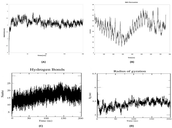 The purpose of using a molecular dynamics simulation is to examine the structural characteristics and microscopic connections between the receptor and the ligand in a docked complex [47]. The GROMACS-2019.4 software suite was used to perform molecular dynamics simulations in order to confirm the stability of the docked complex. In this case, sodium ions were solvated and added to the TIP3P water system for system neutralization. Prior to simulation, the steepest descent approach was employed to check that the system had no steric conflicts or unsuitable geometry, and the temperature was then raised to 300K. Following the equilibration process, the receptor–ligand complex was simulated on a 200 ns time scale. After the MD simulations for the bounded form of the target protein were completed, several Gromacs built-in functions were utilized to analyze various structural parameters such as the RMSD, RMSF, radius of gyration, and hydrogen bond.
