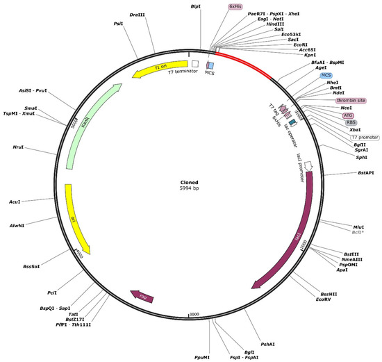 The multi-epitope vaccine sequence was reverse-translated and then optimized for Escherichia coli codon use, resulting in higher expression of the multi-epitope vaccine sequence cloned in the mentioned expression system. The Java Codon Adaptation Tool (Jcat) server (http://www.jcat.de/, accessed on 10 February 2023) was used for the entire activity. The GC content and codon adaptation index (CAI) of cloned sequences were measured to assess their expression. A ratio of 0.8 to 1 CAI is deemed optimum due to favorable transcriptional and translational efficiency, whereas the proper GC content should range between 30–70 percent. SnapGene was used to clone the engineered construct into the pET-28a (+) expression vector.