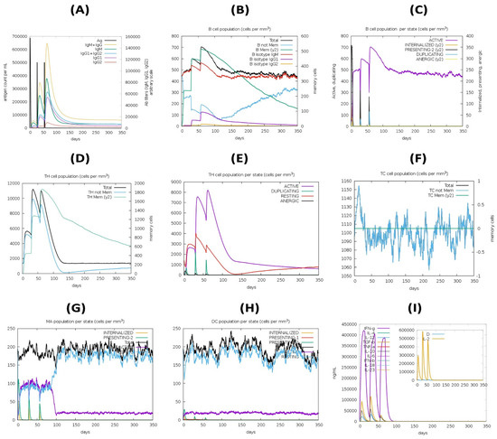 In silico simulation of immune response using vaccine as antigen: (A) antigen and immunoglobulins, (B) B cell population, (C) B cell population per state, (D) helper T cell population, (E) helper T cell population per state, (F) cytotoxic T cell population per state, (G) macrophage population per state, (H) dendritic cell population per state, and (I) production of cytokine and interleukins with Simpson index (D) of immune response.