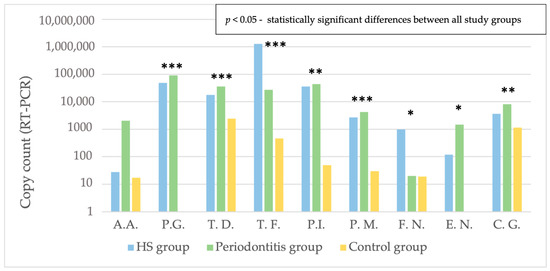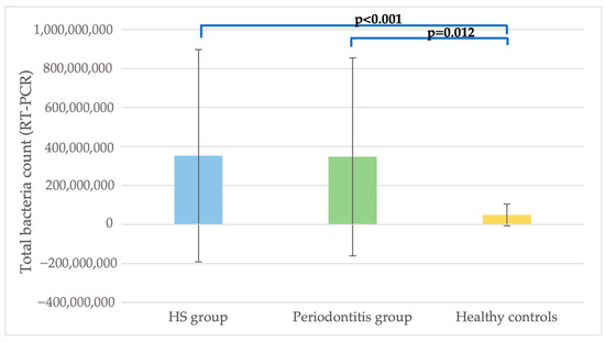 The average copy-count number of total bacteria was significantly higher in the HS and periodontitis samples than in the control samples (p = 0.04) (Figure 1).