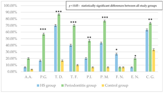Percentages of patients in the HS, periodontitis and control groups with particular -. * p < 0.05, ** p < 0.01, *** p < 0.001, HS: hidradenitis suppurativa, A.A.: Aggregatibacter actinomycetemcomitans, P.G.: Porphyromonas gingivalis, T.D.: Treponema denticola, T.F.: Tannerella forsythia, P.I.: Prevotella intermedia, P.M.: Peptostreptococcus micros, F.N.: Fusobacterium nucleatum, E.N.: Eubacterium nodatum, C.G.: Capnocytophaga gingivalis.