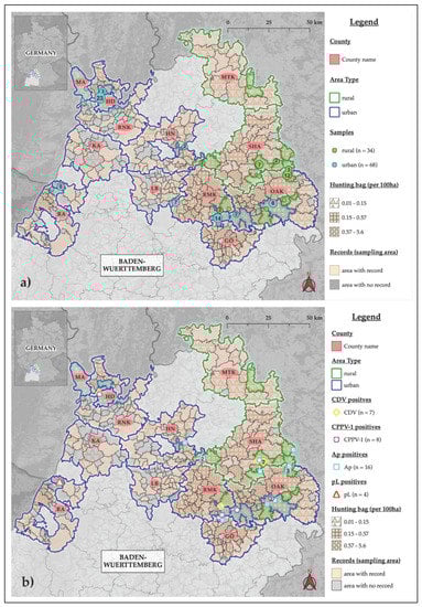 Since the hunting season (according to §10 DVO JWMG 2015, of 25.02.2018) in the sample years for raccoons in BW lasts from August to February, all raccoons were hunted in these months except for one road-killed raccoon in May. In 2019, 32.4% (33/102) of the raccoons were collected from August to December, while in 2020, 67.6% (69/102) of them were collected from January to February and from August to October. Two raccoons were found dead; 100 out of 102 animals were either shot by hunters from a stand (31/100) or caught by a trap and then shot (69/100), according to the current hunting law in BW (§ 41 Section 2 JWMG). The hunters were asked to freeze the collected animals at −20 °C as soon as possible. The municipalities where the hunting sites are located were categorised into rural and urban areas based on the classification of the BBSR [,].
