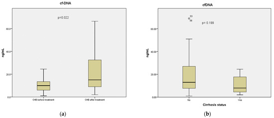 No significant difference was observed in the circulating cf-DNA concentration between carriers and CHB subjects (11.3 vs. 13.0 ng/mL, respectively, p = 0.559). On the other hand, it seemed that treatment for CHB had an impact on the serum abundance of circulating cf-DNA, as evaluated in 17 patients with serum available before and after CHB treatment initiation. Compared to baseline, circulating cf-DNA concentration was significantly increased after the initiation of treatment (10 vs. 15 ng/mL, respectively, p = 0.022) (Figure 1a). No remarkable difference was identified in serum cfDNA concentration between carriers and CHB patients after treatment (11.3 vs. 15 ng/mL, p = 0.173). Moreover, the stage of cirrhosis did not seem to affect any of these markers as there was no significant difference in the serum levels of cf-DNA between the 7 CHB patients with cirrhosis and the 24 non-cirrhotic CHB patients (8 vs. 13 ng/mL, respectively, p = 0.199) (Figure 1b), or in the levels of 5-methyl-2′-deoxycytidine between 5 CHB subjects with cirrhosis and 22 non-cirrhotic CHB subjects (204 vs. 169 ng/mL, respectively, p = 0.336).