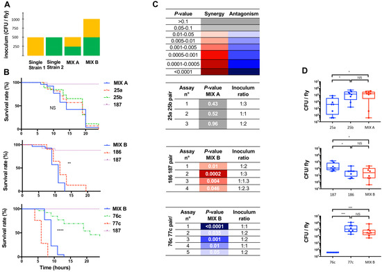 Characteristics of polymicrobial and monomicrobial Drosophila melanogaster wild-type (WT, w1118) infection by pricking with three clinical pairs. The survival curve of coinfection was compared to the survival curve of infection with the individual strain that exhibited the fastest fly killing. n = 30 flies per condition, target ratio of 1:1, E. coli strain 187 used as a negative control, average inoculum of either 500 or 1000 CFU/fly. Experiments were carried out with a mix A inoculum to ensure comparable inoculum between monomicrobial and polymicrobial conditions, ± a mix B inoculum in case of an antagonistic effect on the infection outcome or when one of the bacteria was avirulent (E. coli) to ensure comparable inoculum of the strain that exhibited the fastest fly killing between monomicrobial and polymicrobial conditions. (A) Characteristics of mix A and mix B, as detailed in the method section. (B) Survival curves of flies infected with three clinical pairs, strains 25a ± 25b (top), strains 186 ± 187 (middle), and strains 76c ± 77c (bottom). Survival curves refer to results of one replicate and are representative of at least three independent experiments of the strains tested individually (dotted lines) and in pairs (solid lines), **** p-value < 0.0001, *** p-value between 0.001 and 0.0001 *, ** p-value between 0.01 and 0.001, * p-value between 0.01 and 0.05; NS, nonsignificant. (C) Summary of the assays, including the results of survival curve comparisons (p-values) between mix (coinfection) and the individual strain that exhibited the fastest fly killing, and results of the inoculum ratios of the suspensions used for infection (strain 1: strain 2, targeted ratio of 1:1). Color indicates the type of effect related to the polymicrobial condition on infection outcome with the fastest fly killer: red, synergistic effect; blue, antagonistic effect; grey, no effect (neutral). (D) Bacterial counts and median counts (CFU/fly) at H6 of flies infected with single strain (blue) and mix (red).