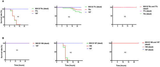Survival curves of wild-type (WT, w1118) Drosophila melanogaster infected with individual strains and with mix comprised of one living strain and one dead strain (left and middle) or two dead bacteria (right). (A) Strains 76c ± 77c, (B) strains 186 ± 187. The survival curve of the coinfection was compared to that of the infection with the individual strain that exhibited the fastest fly killing. Survival curves representative of at least three independent experiments of the strains tested individually (dotted lines) and in pairs (solid lines), n = 30 flies per condition, ratio of 1:1. Bacteria from mix made of two dead bacteria were grown together. NS, nonsignificant.