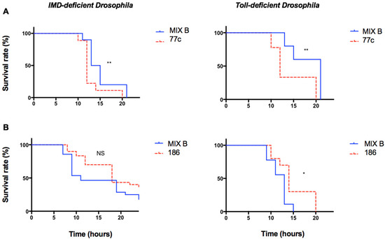Survival curves of different mutant lineages of Drosophila melanogaster infected with individual strains and with mix. The survival curve of the coinfection was compared to that of the infection with the individual strain that exhibited the fastest fly killing. Infected flies belonged to two different lineages: Myd88 mutant flies (Toll deficient) and Relish mutant flies (IMD deficient). Survival curves representative of at least three independent experiments of the strains tested individually (dotted lines) and in pairs (solid lines), n = 30 flies per condition, ratio of 1:1. Experiments were carried out with a mix B inoculum. (A) Strains 76c ± 77c, (B) strains 186 ± 187. ** p-value between 0.01 and 0.009, * p-value between 0.01 and 0.05.