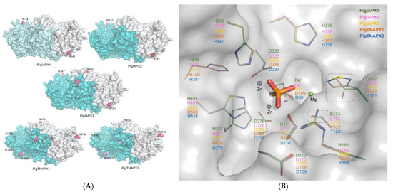 4.10. Modeling of Porcine AP Isoforms’ N-Glycosylation Sites and Architecture of Catalytic Sites