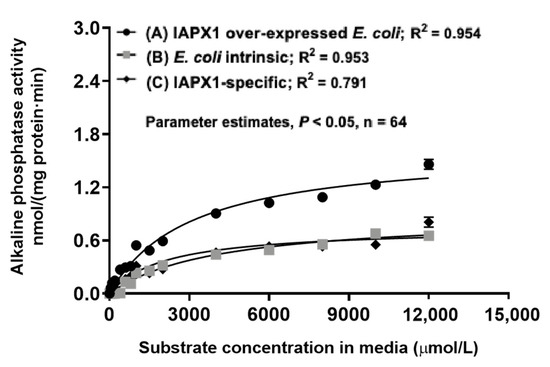 - Martinez, M.B.; Schendel, F.J.; Flickinger, M.C.; Nelsestuen, G.L. Kinetic properties of enzyme populations in vivo: Alkaline phosphatase of the Escherichia coli periplasm. Biochemistry 1992, 31, 11500–11509. [Google Scholar] [CrossRef] [PubMed]
