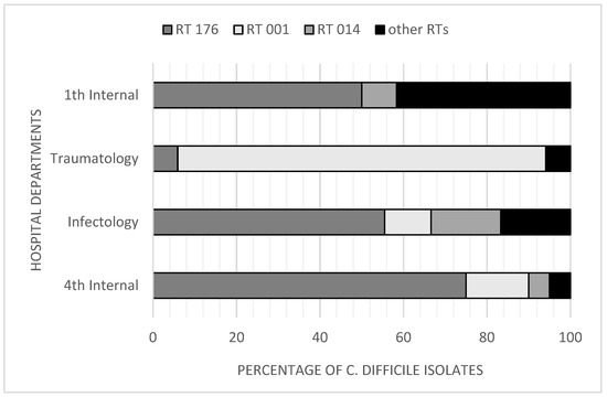 By PCR ribotyping, three ribotypes were detected with the highest frequency: RT 176 (n = 40, 47.6%); RT 001 (n = 23, 27.4%); and RT 014 (n = 7, 8.3%). The remaining ribotypes (n = 12) were RT 020, RT 010, RT 027, RT 078, RT 003, and new RTs. They did not exceed three isolates per RT profile. In two cases, ribotyping failed (Figure 1). Table 3 indicates the association of CD ribotypes with three toxin gene profiles identified among the C. difficile isolates. The highest incidence of CDI and frequently isolated RTs was observed in four hospital departments (Figure 2). The isolates of RT 176 were most common in the fourth Department of Internal Medicine (n = 15), Infectology (n = 10), and the first Department of Internal Medicine (n = 6), and the isolates of RT 001 were most common in Traumatology (n = 15).