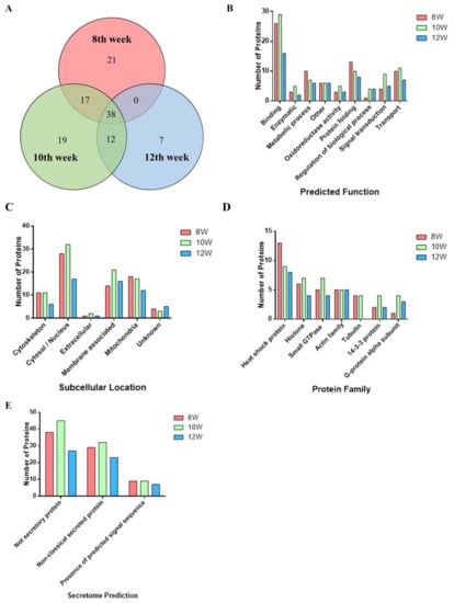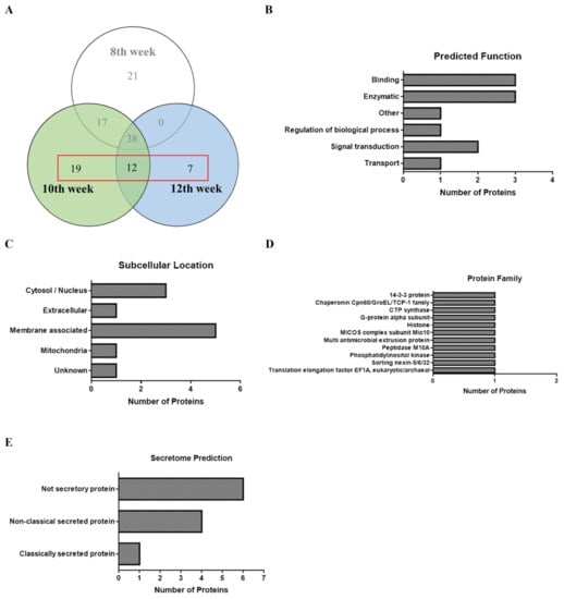 Analysis of the proteins identified between and among the SEA proteins prepared from eggs recovered at the 8th, 10th, and 12th infection weeks. (A) Venn diagram; (B) predicted function; (C) subcellular location; (D) protein family (Pfam) analysis of the three most abundant proteins; (E) secretome (SecP) analysis.