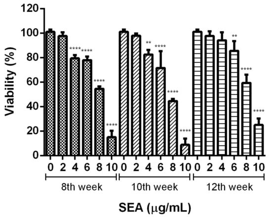 Effect of various concentrations of the SEA on the viability of LX-2 cells. The results of four separate experiments were averaged and shown as a percentage of cell viability compared to the viability of the untreated control. Data are expressed as the mean ± standard deviation (SD). ** p < 0.01 and **** p < 0.0001 as compared with the untreated control.