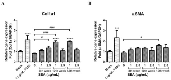 At the end of the co-culture incubation, RNA was extracted from the LX-2 cells. The Col1a1 and α-SMA mRNA expression levels in the LX-2 cells were used as fibrosis markers. An increased mRNA expression of Col1a1 was observed in the LX-2 cells co-cultured in the presence of the SEA-pretreated PBMCs in comparison to the control LX-2 cells co-cultured PBMCs without SEA treatment (Figure 5A). The 2.5 μg/mL group of the 8th week, the 1 μg/mL group of the 10th week, and the 1 μg/mL group of the 12th week all significantly increased as compared to the control (p < 0.05, p < 0.0001, and p < 0.0001, respectively). The slight increase in mRNA expression of α-SMA was however not significant except in the 1 μg/mL group of the 12th week (p < 0.05, Figure 5B).