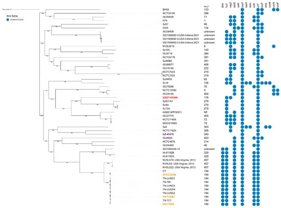 Genome assembly and phylogenetic analysis were performed as previously described [12]. The genome sequencing and assembly data were deposited at NCBI under BioProject Accession: PRJNA791851. Single nucleotide polymorphisms (SNPs) of this and other 48 S. zooepidemicus isolates from the previous study were identified by running kSNP3 in standard mode. The optimal k-mers size was calculated by the Kchooser program kSNP (CA, USA, v. 3.0), and the whole-genome phylogeny was analyzed based on identified core genome SNPs [13]. Sequence type (ST) based on 7 highly conserved housekeeping genes (arc, nrdE, proS, spi, tdk, tpi, and yqiL) [14] was assigned for each S. zooepidemicus genome according to the PubMLST S. zooepidemicus database at http://pubmlst.org/szooepidemicus (accessed on 14 November 2021) [15]. Putative virulence genes were retrieved from genome sequences according to previous publications [16,17,18,19,20]. Tree Of Life iTOL at https://itol.embl.de (accessed on 14 November 2021) [21] was used for display, manipulation, and annotation on the base of the core SNPs tree.
