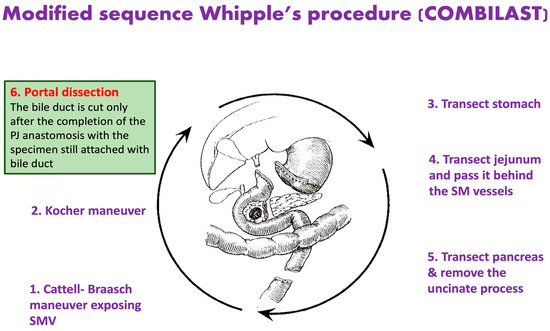 We designed this prospective cohort study to elucidate the incidence of SSIs in patients undergoing pancreaticoduodenectomy (PD) through the modified steps we propose for periampullary malignancy. The secondary objectives include an assessment of the postoperative return of bowel activity, the difference in length of hospital stay, added surgical advantages, and the incidence of postoperative morbidity and mortality. We coined the modified technique COMBILAST as an acronym for the sequence of Whipple’s procedure’s “common bile duct last” approach.