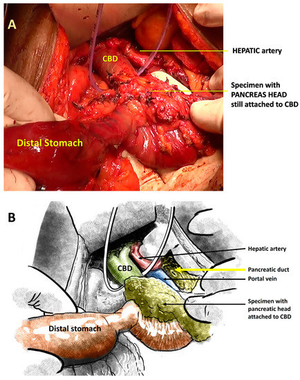 (A): Intraoperative photograph showing the specimen where the pancreatic head is still attached to the CBD. (B): Schematic illustration of the same.