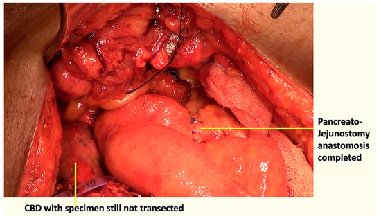 Pancreatojejunostomy anastomosis completed with the specimen still attached to the CBD.