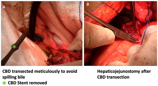 After the PJ anastomosis, the CBD was divided with minimal bile spillage (A), and the hepaticojejunostomy anastomosis was completed (B).