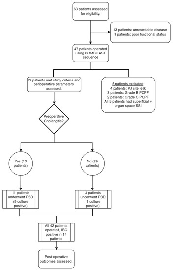 During the study period, we assessed 63 cases for operability. Of them, 13 patients had an unresectable disease based on preoperative imaging or a staging laparotomy, and three were deferred surgery due to poor functional status. A total of 47 patients underwent the Whipple procedure using the COMBILAST sequence. We excluded five patients from the study because of postoperative anastomotic leaks and pancreatic fistulas. A total of 42 patients were considered for the final analysis. The flow diagram of our study is shown in Figure 5.