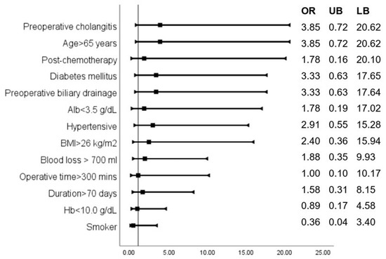 - Takahashi, Y.; Takesue, Y.; Fujiwara, M.; Tatsumi, S.; Ichiki, K.; Fujimoto, J.; Kimura, T. Risk factors for surgical site infection after major hepatobiliary and pancreatic surgery. J. Infect. Chemother. 2018, 24, 739–743. [Google Scholar] [CrossRef]