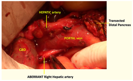 - Turrini, O.; Wiebke, E.A.; Delpero, J.R.; Viret, F.; Lillemoe, K.D.; Schmidt, C.M. Preservation of Replaced or Accessory Right Hepatic Artery During Pancreaticoduodenectomy for Adenocarcinoma: Impact on Margin Status and Survival. J. Gastrointest. Surg. 2010, 14, 1813–1819. [Google Scholar] [CrossRef]