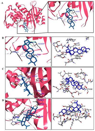 Interactions between the enzymes and BA compounds and controls can be seen in Figure 2, Figure 3, Figure 4, Figure 5, Figure 6 and Figure 7. Descriptions of these interactions can be seen in Table 7 and Table 8.