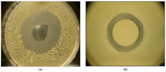 Based on the previous results of repeated experiments, we choose X. budapestensis DSM16342 (EMA) and X. szentirmaii DSM 16338, (EMC) which had been identified in our laboratory, [34] and seem to be the most promising strains as antimicrobial producers we have ever come across so far. This statement also stands for their anti-Clostridial potential. For the exact description and history of these strains, see Ref. [35]. We retested the in vitro efficiency [36,37,38] in overlay bioassays and the pepsin resistance of the active ingredient that we previously published [39], (Figure 1a,b).