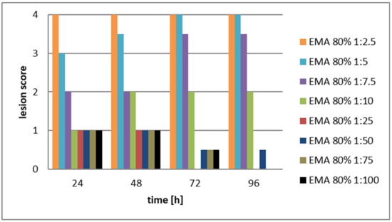Destruction of LMH [48] cell monolayer caused by serially diluted EMA CFCM samples. The scoring system is [47] shown in Table S1. (Abbreviations: EMA= Xenorhabdus budapestensis DSM16342(T) (Lengyel). CFCM= cell-free conditioned culture media). Rough data are given in Supplementary Table S3.) Above 1.5 v/v% of the EMA CFCM concentrations (that is below 1.5 v/v dilutions) the differences between the score values representing the degree of cytotoxicity differed significantly in a dose-dependent manner, at least at lower dilutions, (<8 v/v%), where the cytotoxic damages seem to be regenerating. The degree of significance was detectable at 0.001 < p < 0.005 level at each consecutive measurement between the following values: At 24 h: EMA 80:1:2.5 > EMA 80:1:5 > EMA 80:1:7.5 > EMA 80:1:10 = EMA 80:1:25 = EMA 80:1:50 = EMA 80:1:100. At 48 h: EMA 80:1:2.5 > EMA 80:1:5 > EMA 80:1:7.5 = EMA 80:1:10 = EMA 80:1:25 = EMA 80:1:50 = EMA 80:1:100. At 72 h: EMA 80:1:2.5 = EMA 80:5 > EMA 80:1:7.5 > EMA 80:1:10 > EMA 80:1:50 = EMA 80:1:75 EMA = 80:1:100. At 96 h: EMA 80:1:2.5 = EMA 80:5 > EMA 80:1:7.5 > EMA 80:1:10 > EMA 80:1:50.