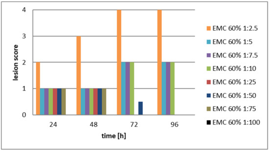 Destruction of LMH [48] cell monolayer caused by serially diluted EMC CFCM samples. The scoring system is [47] shown in Table S1. (Abbreviations: EMC = Xenorhabdus budapestensis DSM16338(T) (Lengyel). CFCM = cell-free conditioned culture media). Data and statistics are given in Supplementary Table S2. EMC CFCM seems to be less cytotoxic than EMA CFCM. Above 12 v/v% of the EMC CFCM concentrations (that is below 12 v/v dilutions) the differences between the score values representing the degree of cytotoxicity did not differ significantly in a dose-dependent manner, at least at lower dilutions, (<12 v/v%), where the cytotoxic damages seem to be partially regenerating. The degree of significance was detectable at 0.001 < p < 0.005 level at each consecutive measurement between the following values: At 24 h: EMC 60:2.5 > EMC 60:5 = EMC 60:1:7.5 = EMC 60:1:10 = EMC 60:25 = EMC 60:1:50 = EMA = EMC 60:1:75 = EMCA 0:1:100. At 48 h: EMC 60:2.5 > EMC 60:5 = EMC 60:1:7.5 = EMC 60:1:10 = EMC 60:25 = EMC 60:1:50 = EMA = EMC 60:1:75 = EMC 0:1:100. At 72 h: EMC 60:2.5 > EMC 60:5 = EMC 60:1:7.5 = EMC 60:1:10 > EMC 60:1:50. At 96 h: EMC 60:2.5 > EMC 60:5 = EMC 60:1:7.5 = EMC 60:1:10.