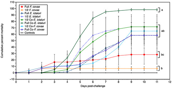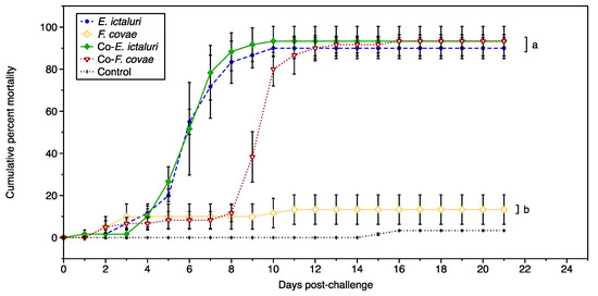 The cumulative percent mortality from Trial B due to single infections of E. ictaluri or F. covae and co-infections from both pathogens over the entirety of the trial (11 days). Letters represent significance within treatment groups. Each treatment group had three tanks (n = 3). Bars represent the standard error of the mean for each day.